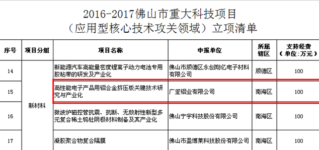 2017年我司申请的《高性能电子产品用铝合金挤压板关键技术研究与产业化》项目获得佛山市首批重大科技项目(应用型核心技术攻关领域)项目的立项肯定及100万的资金奖励,充分体现了我司突破该关键核心技术、提高自主创新能力,广亚高性能电子产品用铝合金挤压板技术将更上一层楼。该项目的成功研发与推广应用将为行业的转型升级起到很好的示范作用,打破国外的技术垄断,带动铝型材加工行业产业结构调整和高附加值方向发展。