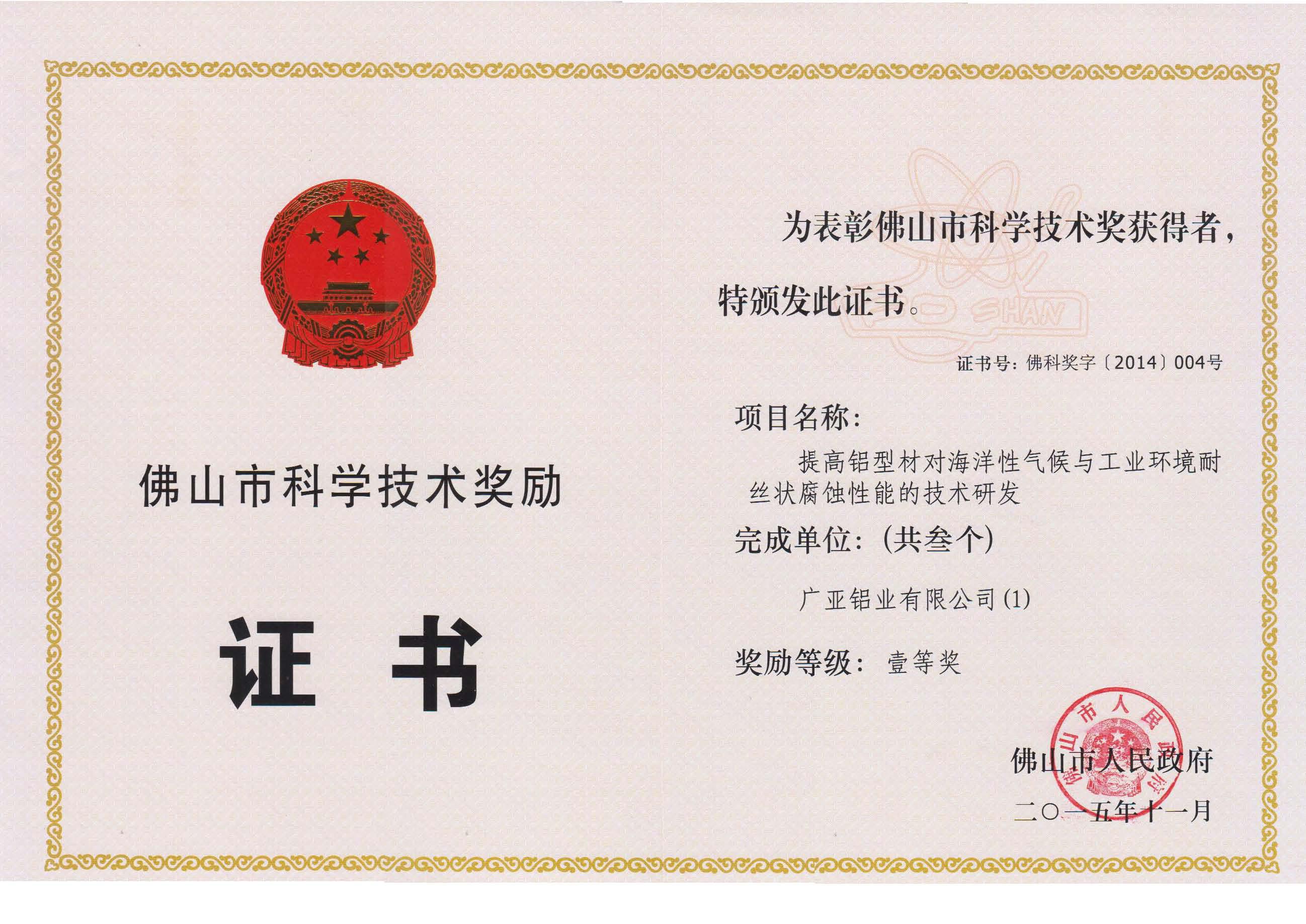 通过广泛的产学研合作,公司科研成果硕果累累,近年来先后获得中国有色金属工业科学技术进步奖一等奖1项、二等奖3项、三等奖1项,佛山市科学技术奖一等奖1项、三等奖2项,2017年《提高铝型材对海洋性气候与工业环境耐丝状腐蚀性能的关键技术》更是获得广东省科学技术奖二等奖。我司也重视知识产权保护,目前有效授权发明专利5项,实用新型专利59项,外观专利115项。企业还积极参与起草和制修订国际、国家和行业标准和联盟标准达40多项,多次获得技术标准优秀奖励。