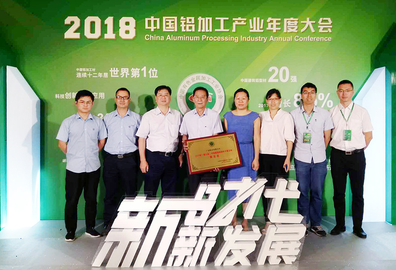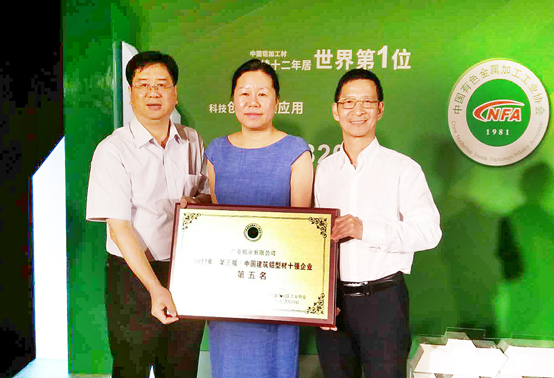集团邝丽霞副总裁在年会主背景前留影 本届年会首日重头戏为2017年(第三届)中国建筑铝型材十强和二十企业授牌仪式。广亚铝业凭借22年厚积薄发、精耕细作,实至名归,荣获中国建筑铝型材十强企业第五名。潘学著总工程师代表企业领取了牌匾。