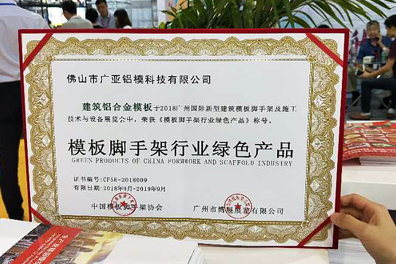 广亚铝模荣获中国模板脚手架行业绿色产品证书