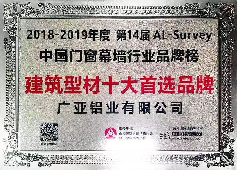 3月3日,第25届全国铝门窗幕墙行业年会在广州举行。广亚集团旗下广亚铝业凭借卓越品牌号召力,和长达23年的行业精耕,在第14届中国门窗幕墙行业首选品牌、喜爱工程颁奖仪式上,获得“建筑型材十大首选品牌”。