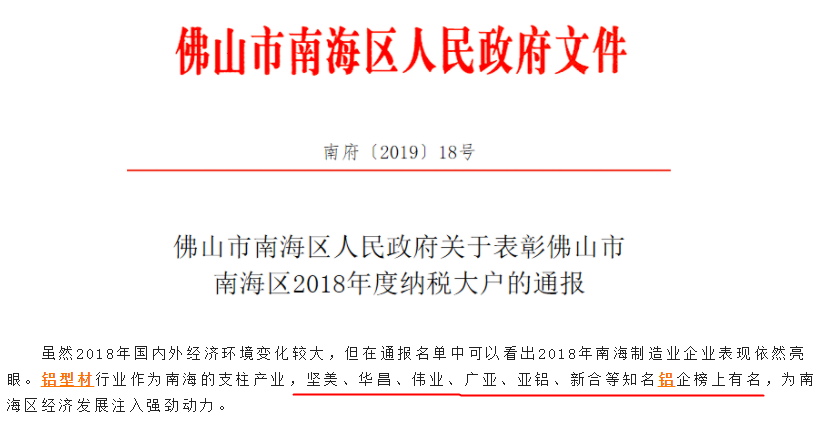 近日,南海区政府发布了关于表彰2018年度纳税大户的通报,决定对纳税超千万元的560家企业进行通报表彰。虽然2018年国内外经济环境变化较大,但在通报名单中可以看出2018年南海制造业企业表现依然亮眼。铝型材行业作为南海的支柱产业,为南海区经济发展注入强劲动力。