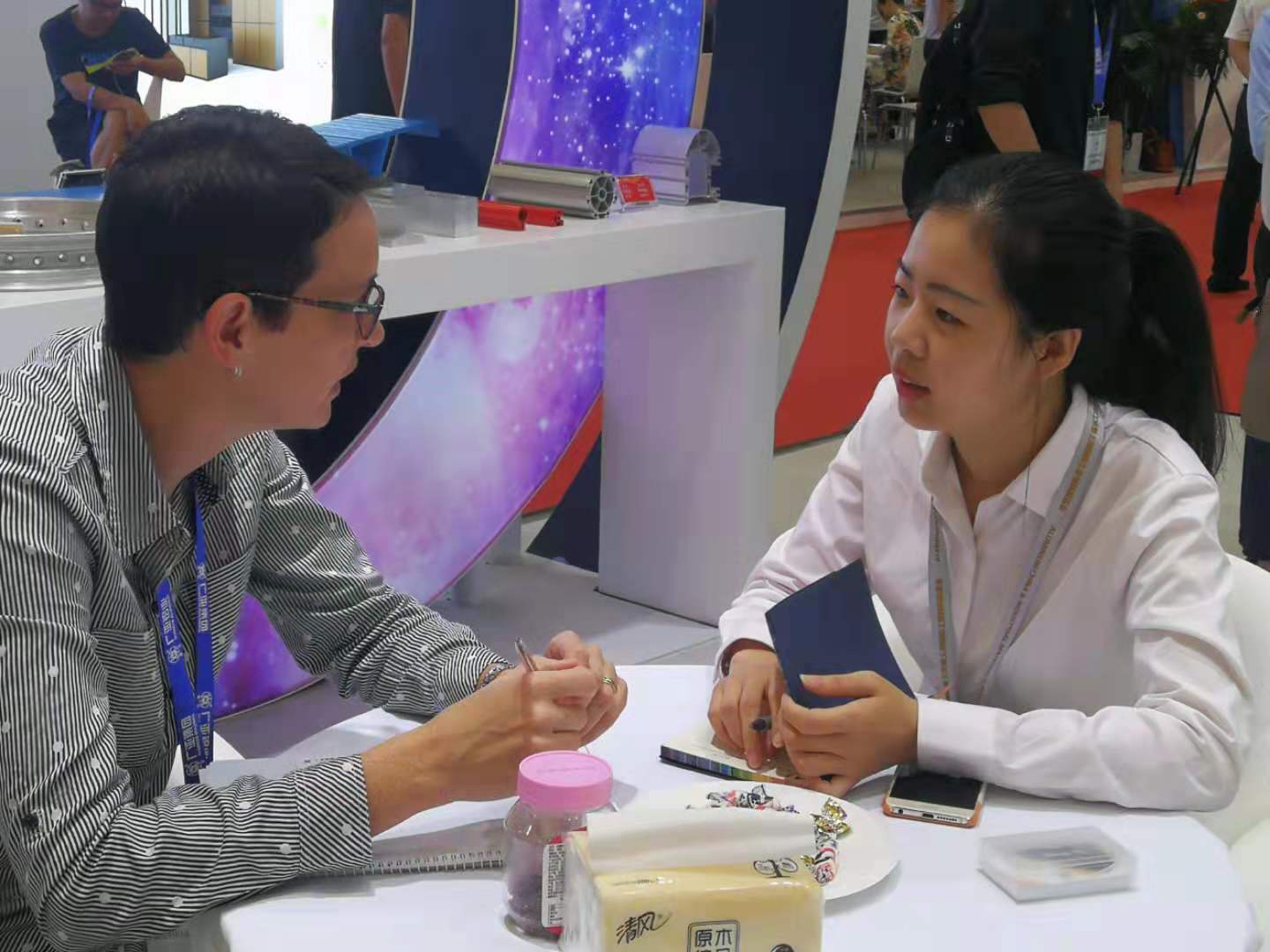 被广亚铝业吸引前来参观交流的客户络绎不绝,工作人员在一旁进行专业细心的解答。通过洽谈和观看样品展示,客户对广亚铝业的品牌影响力、产品质量、研发创新能力、优质服务等方面都有了全面了解,为后面的项目合作奠定了良好基础。