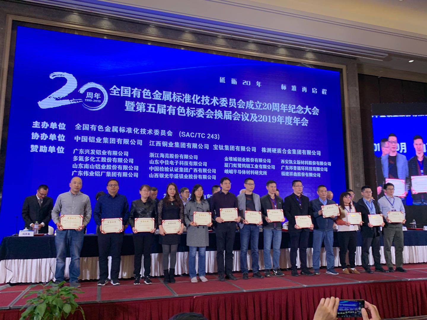 大会表彰了有色金属标准化终身成就奖、有色金属标准化20年突出贡献奖、2019年度有色标委会技术标准优秀奖、2019年度有色金属标准化工作特殊贡献奖、2019年度有色金属标准化先进工作者。广亚铝业有限公司王岗获得“2019年度有色金属标准化先进工作者”荣誉称号。