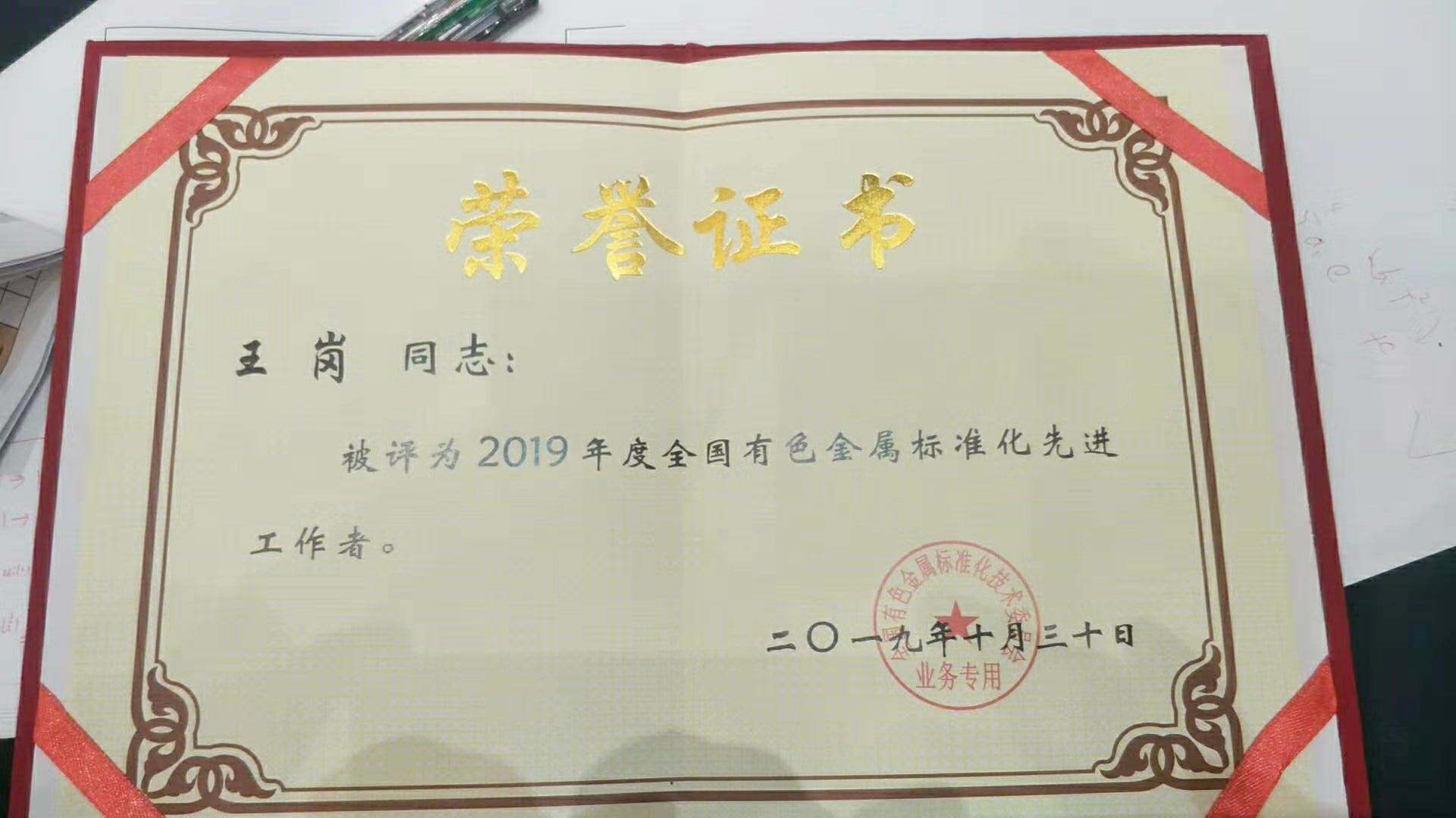 王岗获得“2019年度有色金属标准化先进工作者”荣誉称号(右二)
