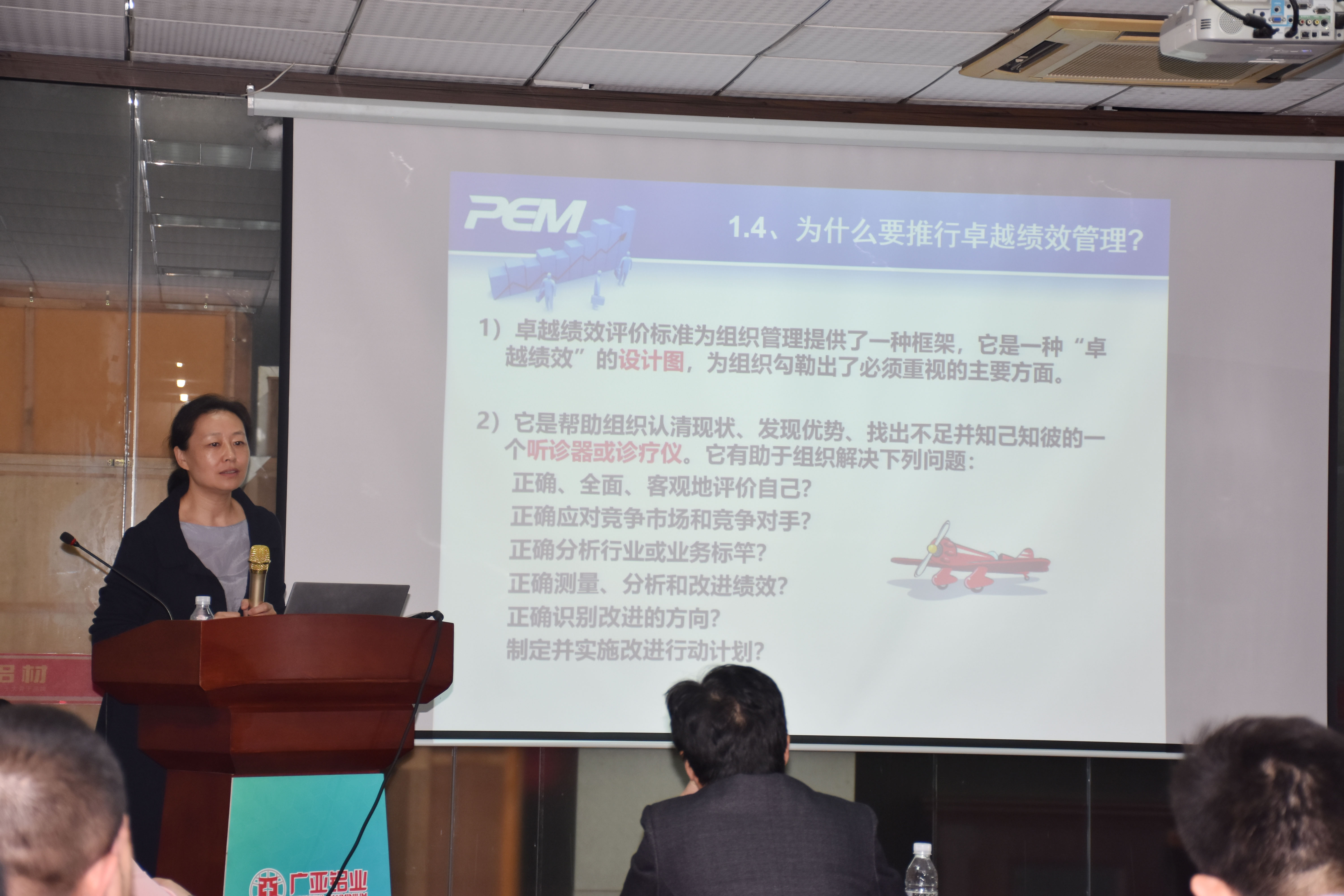 培训课上,专家从领导、战略、顾客与市场、资源、过程管理、测量分析与改进、结果等七个方面向广亚的各个部门负责人传授卓越绩效标准,总结企业在建立绩效标准中经常会遇到的问题,并对相关案例进行精辟分析。