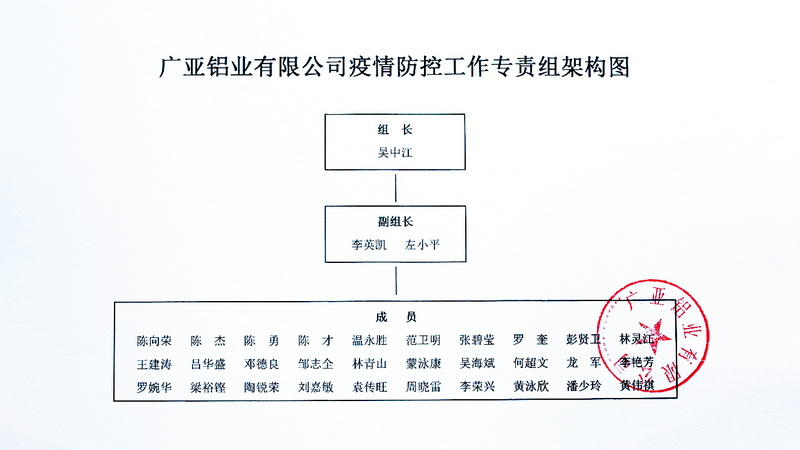 自1月下旬开始,有关武汉出现疫情的报道就不断传来,特别是在1月23日(年二十九)武汉“封城”之后,全国的防疫形势就一下子紧张起来了。广亚也在密切关注形势发展,并已预计到可能对复工复产造成的影响。公司随即成立了由吴中江总裁亲自挂帅的疫情防控领导小组。铝业事业部总经理李英凯和人力资源部总经理左小平任副组长,各部门主要负责人任组员。