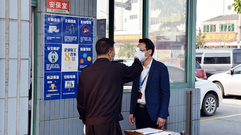 员工入厂时,要求配带口罩。复工后,口罩由公司提供,每天一只换新。员工在厂门口接受体温检测,在填写《体温检测登记表》后,凭工作证和先前已经发放到员工手上的实名临时出入证方可入厂。每天公司都会安排人力资源部一两名同事与保安员一道,在大门口协助员工安全入厂,遇有突出情况,及时协调处理。