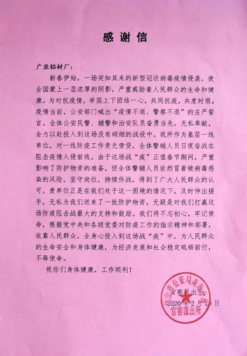 同抗疫、警民情!广亚铝业向社区民警赠送防护品!