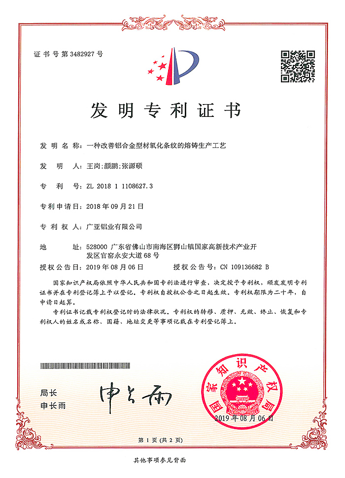 据悉,广亚自2018年10月以来,在不到一年半的时间里,就先后申请了18项国家专利,包括发明专利8项,实用新型10项。其中《一种改善铝合金型材氧化条纹的熔铸生产工艺》已获得发明授权;《一种异型密封隔热条》等7项已获得实用新型授权。 |