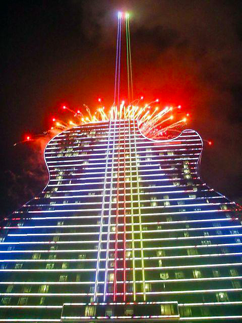 酒店按真吉他比例打造,拥有流动吉他弧线立面,在“琴身”之上整齐排列着六根平行的琴弦。建筑顶部安装的LED大炮组可将9.1公里的远程光束投向20000英尺深空,从而将“弦”无限延伸,成为完整的巨型“吉他”。