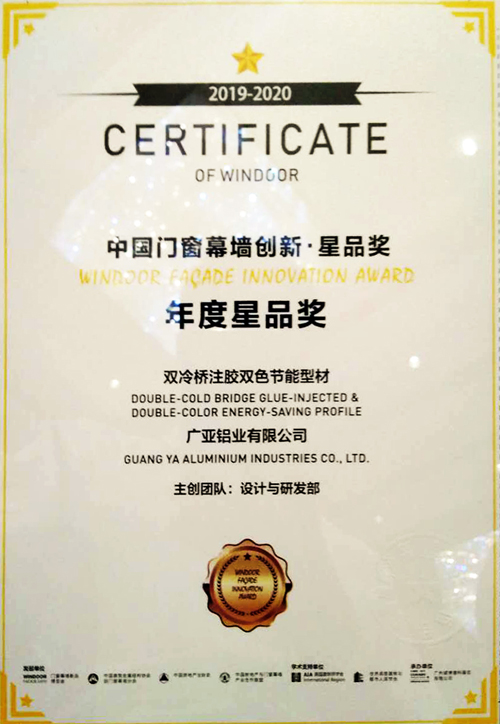 在当晚进行的中国门窗幕墙创新·星品奖颁奖典礼上,广亚铝业“双冷桥注胶双色节能型材”产品,从500多家候选企业产品中脱颖而出,一举荣获创新·星品奖。这也是该奖自2015年正式评选以来,广亚铝业第4次荣获该奖。 双冷桥注胶双色节能型材采用了独创专利技术:聚胺基甲酸乙酯(PU)和高强度玻纤强化尼龙(PA66GF25)双重连接的创新结构,在这两种隔热材料的完美结合下,型材的强度可达到国标标准值的三倍以上,彻底解决了传统注胶型材横向抗拉强度低及高温力学性能差、穿条型材纵向剪切强度及低温力学性能不理想以及两侧隔热穿条位易渗水的行业难题,并可轻易实现注胶型材大截面结构,实现了美式注胶节能技术和欧洲穿条节能技术的完美结合。