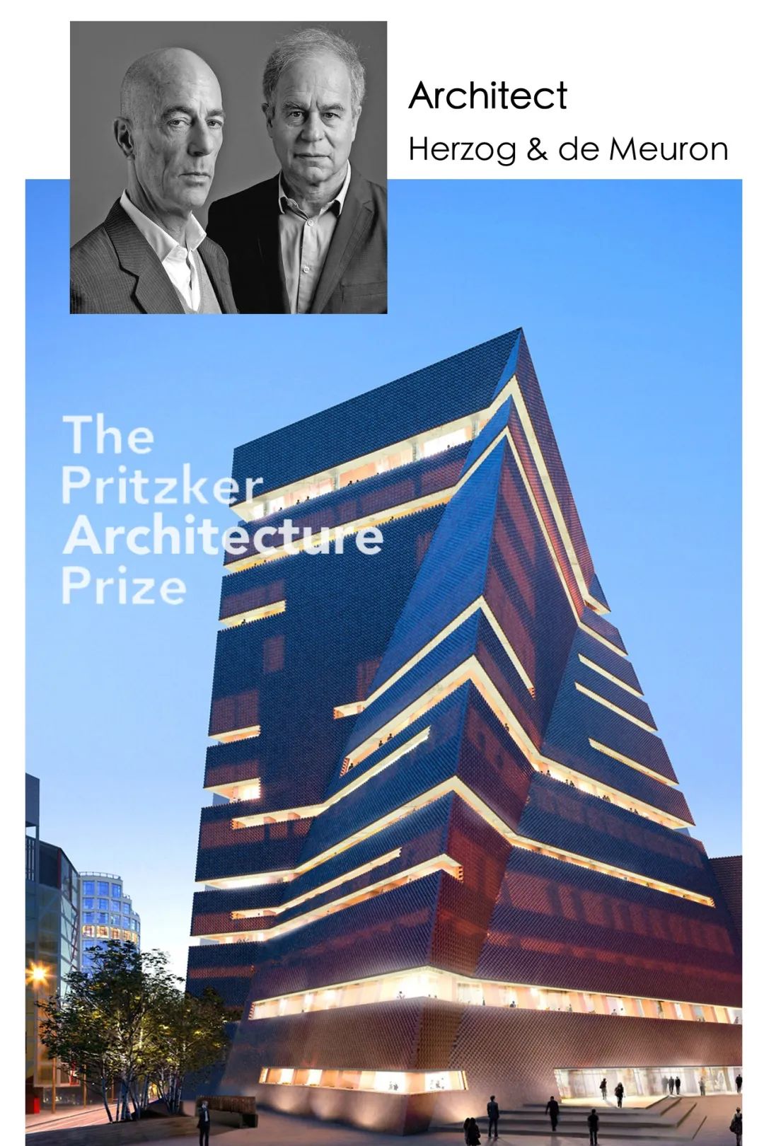 大厦整体建筑设计由普利兹克奖(Pritzker Prize,被誉为建筑界的“诺贝尔”)得主,瑞士著名建筑师赫尔佐格&德梅隆(Herzog & de Meuron)执笔。其代表作包括:北京奥运会“鸟巢”、伦敦泰特现代美术馆(Tate Modern,普利兹克获奖作品)等。