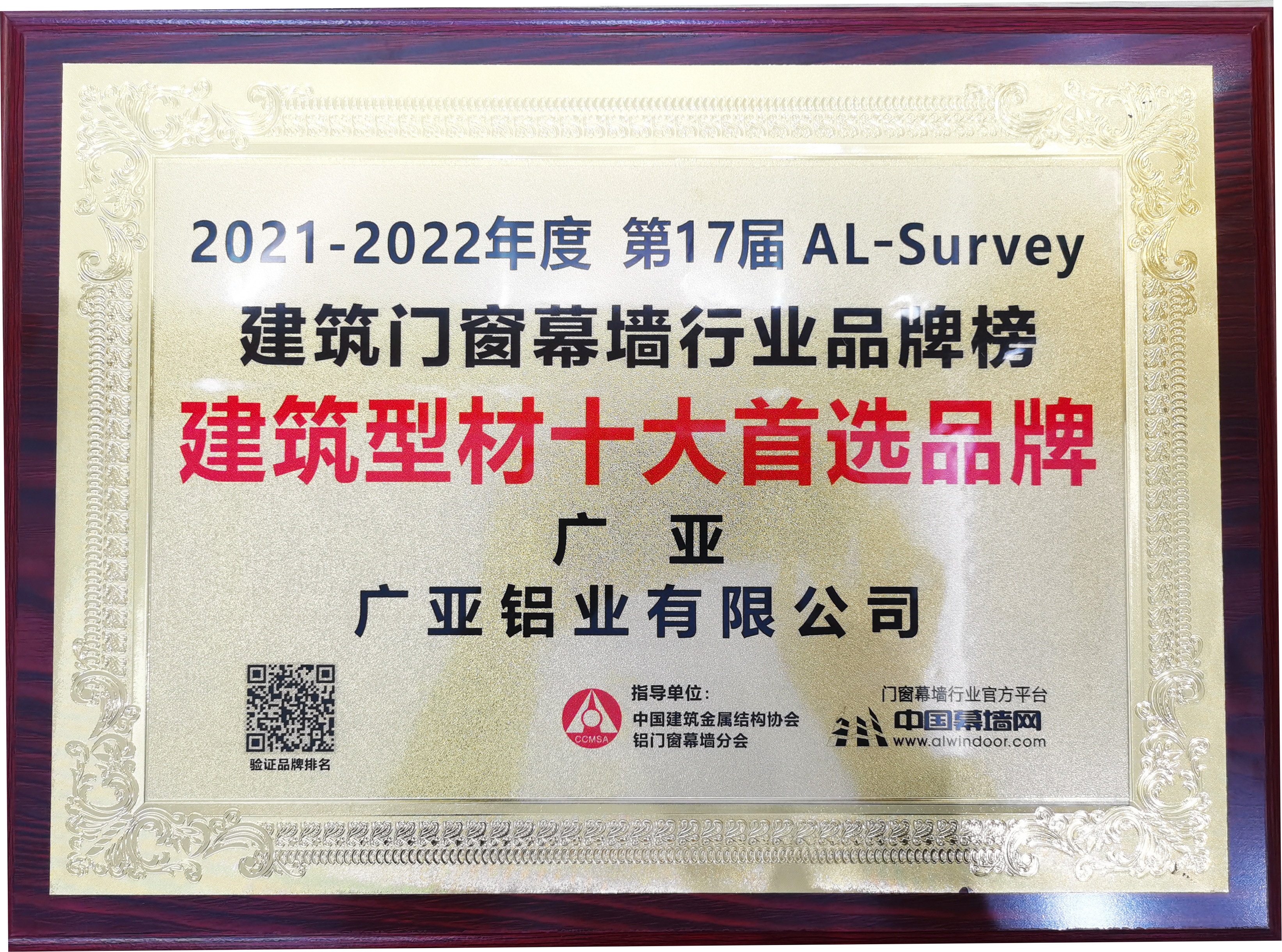 (简称“AL-Survey”)在广州南丰国际会展中心隆重举行。广亚铝业再次被评为“建筑型材十大首选品牌”,这是广亚铝业连续五年获此殊荣!