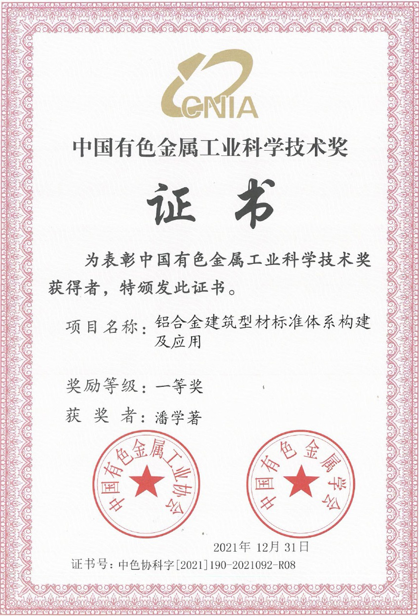 参与攻关的“铝合金建筑型材标准体系构建及应用”项目荣获中国有色金属工业科学技术奖一等奖。