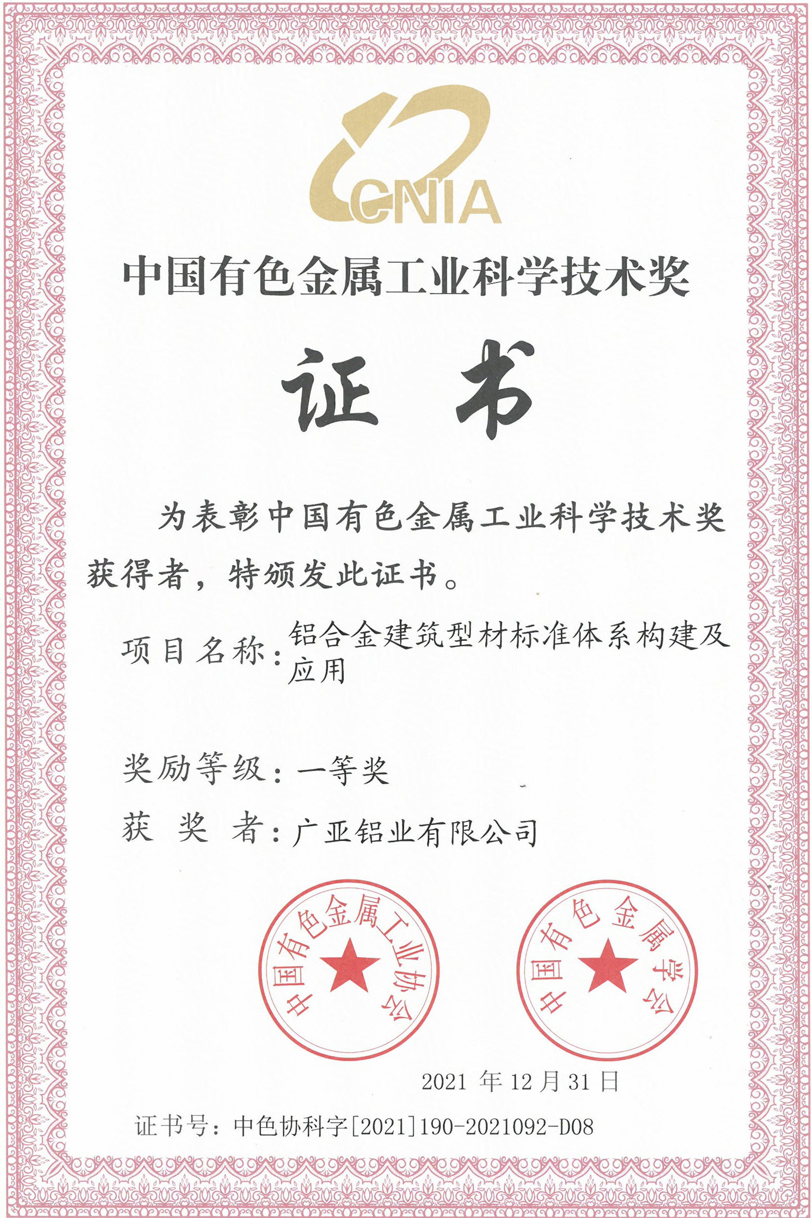 广亚铝业荣获中国有色金属工业科学技术奖一等奖