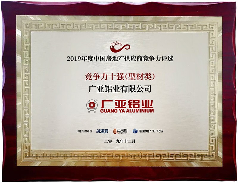 广亚铝业荣登“2019年度中国房地产供应商行业竞争力十强”榜!
